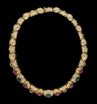 1209Collier 750-Gelbgold, Smaragde und Rubine, besetzt mit 130 Brillanten, ein Goldglied leicht besch. 179 g. Auktion: Donnerstag, 05.12.2013 ab 12:00 2200 EUR |