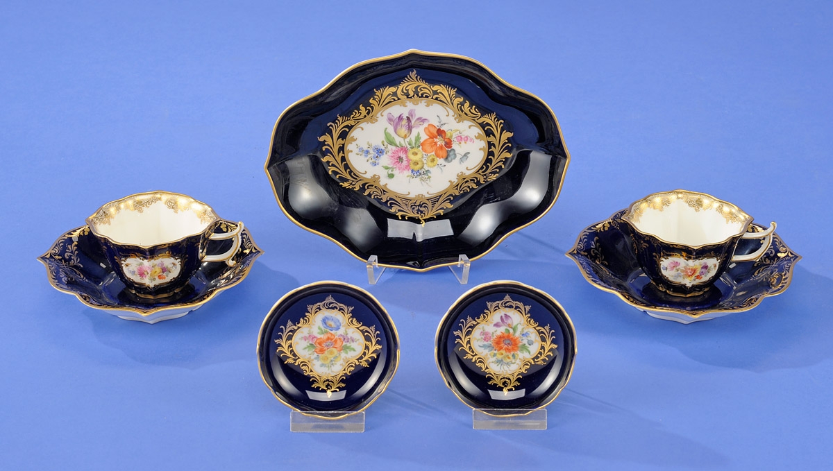 838Meissen-Konvolut Sieben Teile Zwei Mokkatassen mit Untertassen, Konfektschale und zwei Schälchen. Schwertermarke. 150 EUR |