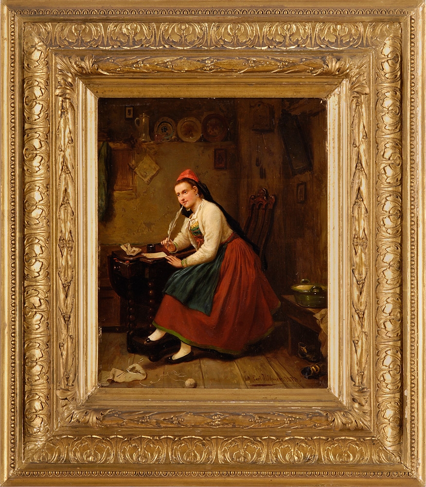 274Hübner, Carl Wilhelm 1814 Königsberg - 1879 Düsseldorf Der Brief an den Liebsten. Signiert. Datiert 1873. Öl/Holz, 38 x 30 cm 800 EUR |