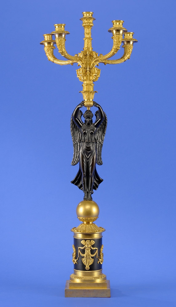 1307Empire-Girandole 19. Jhdt. Fünfflammig. Plastische Viktorie. Bronze, feuervergoldet und patiniert. H 80 cm 300 EUR |