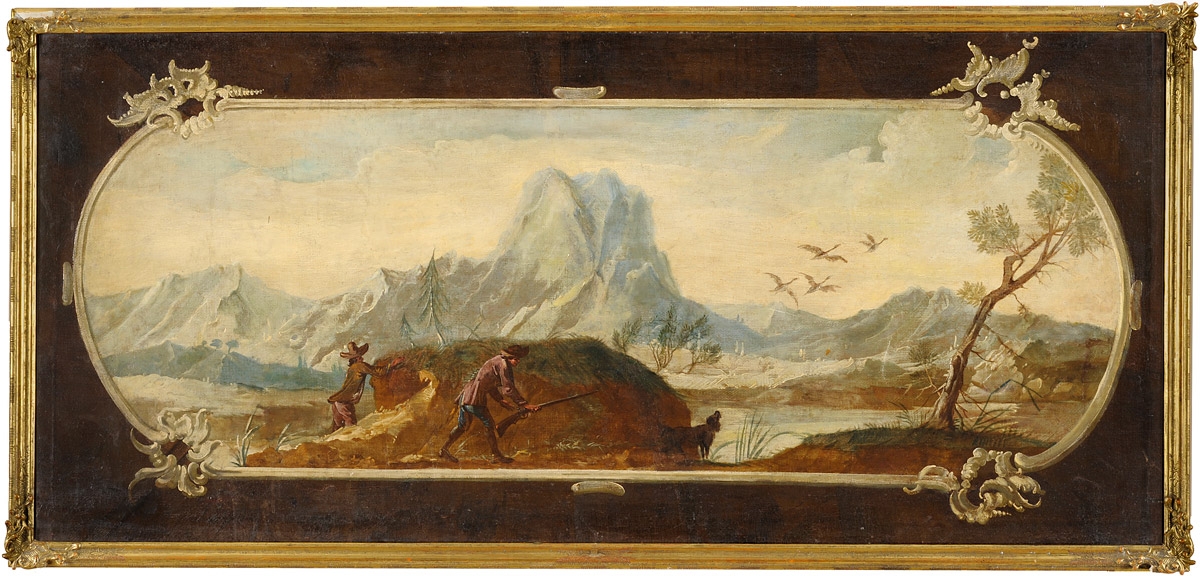 Italien 18. Jhdt. Jäger mit Hunden auf Entenjagd. Öl/Lwd., 62 x 136 cm