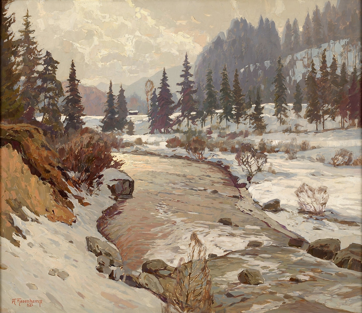 264Hasenkamp, Adolf 1927 Hamburg - 2002 im Tessin Winterlandschaft. Signiert. Öl/Platte, 90 x 106 cm 150 EUR |