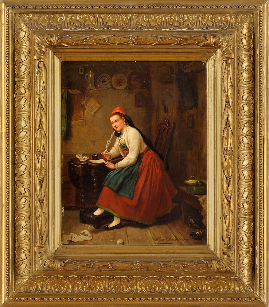298Hübner, Carl Wilhelm 1814 Königsberg - 1879 Düsseldorf Der Liebesbrief. Signiert. Datiert 1873. Öl/Holz, 38 x 30 cm 400 EUR |
