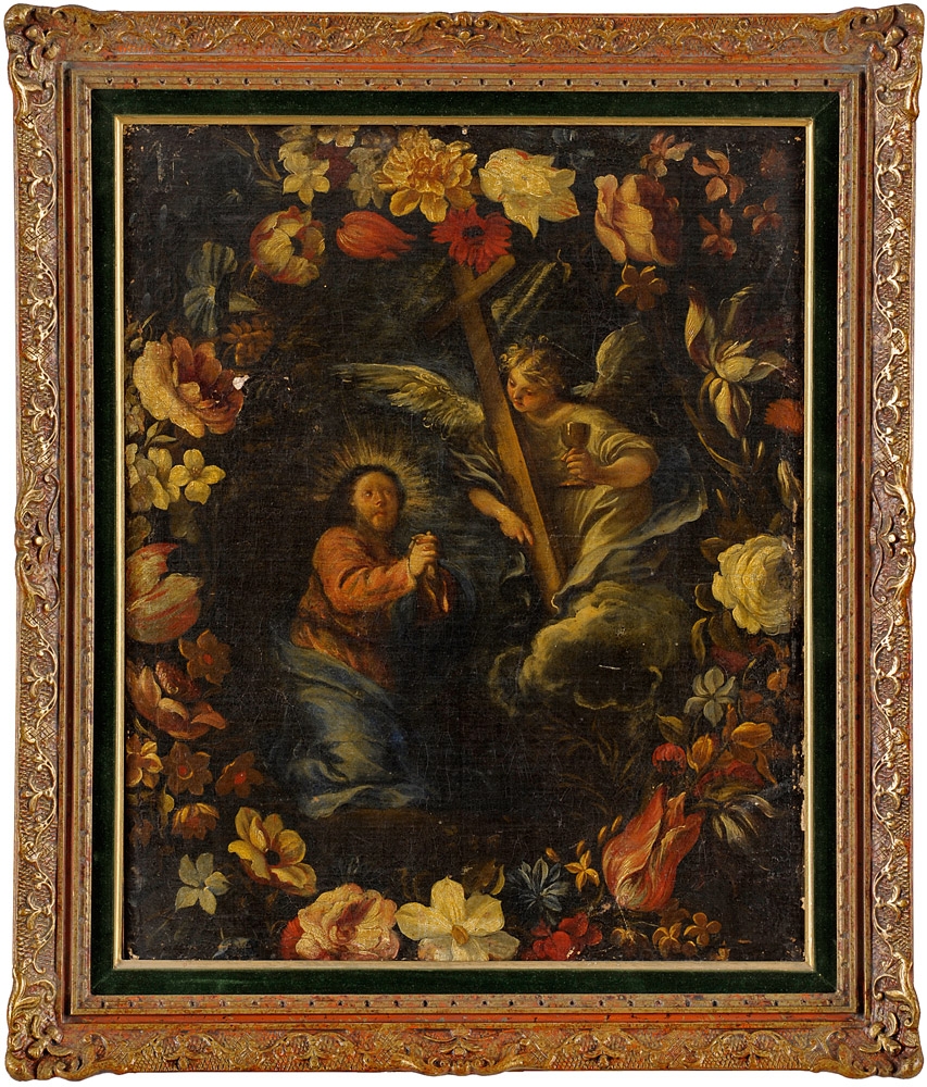 Italien 18. Jhdt. Heiliger Andreas und Engel umrahmt von Blütengirlande. Öl/Lwd./doubl., 62 x 50 cm
