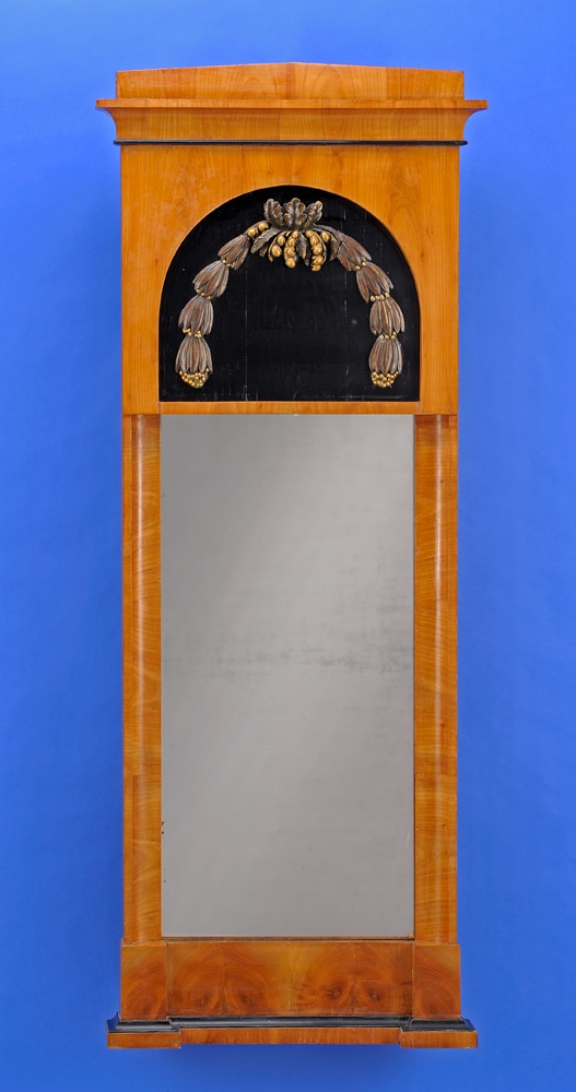 877Spiegel Deutsch, erstes Drittel 19. Jhdt. Kirschbaum, zum Teil geschwärzt. Geschnitzte Applikationen. H 170 cm, B 67 cm 600 EUR |