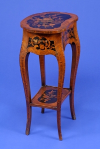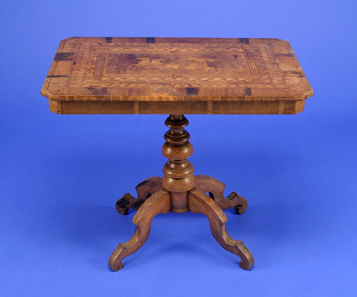 881Tisch Italien, Mitte 19. Jhdt. Nußbaum, reich intarsiert. Platte mit römischen Streitwagen der Antike. H 78 cm, B 90 cm, T 60 cm 200 EUR |