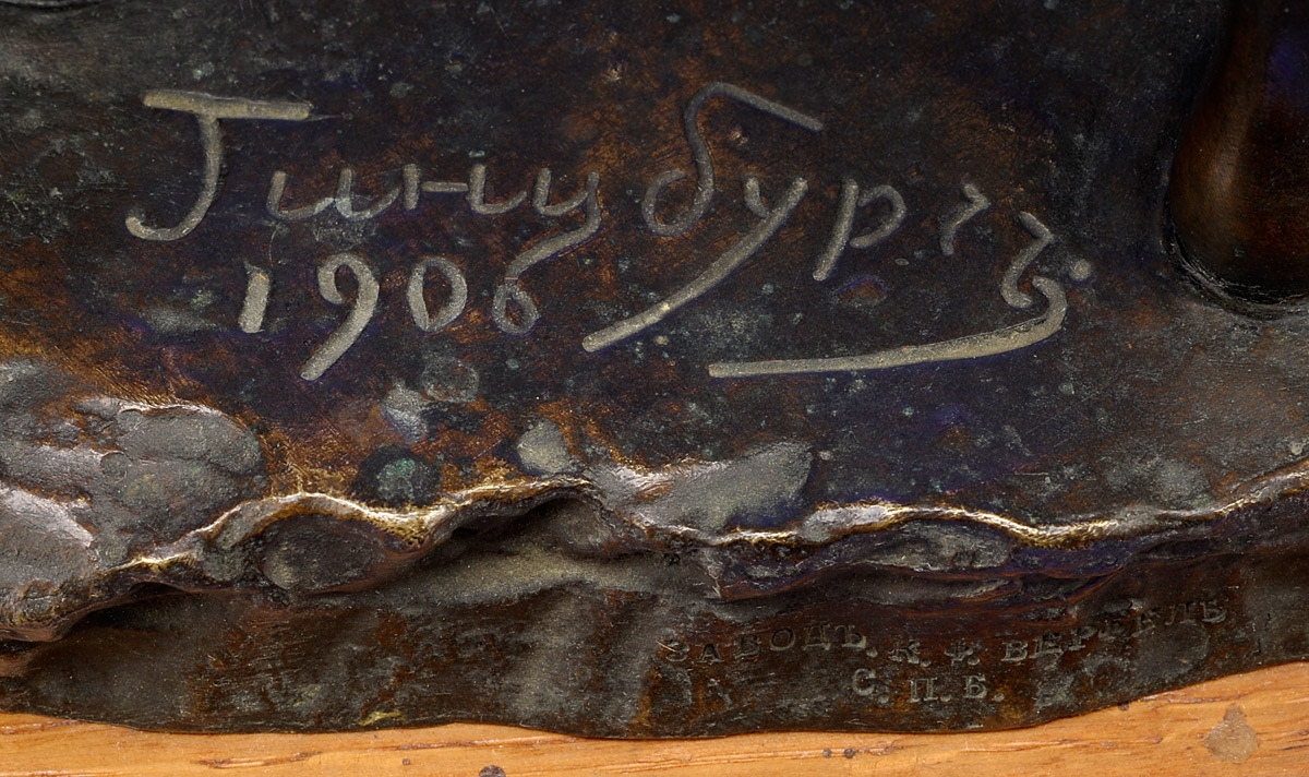 957Ginzburg, Ilya Jacowlewitsch 1859 - 1939 Gestikulierender Junge. Bronze. Signiert. Datiert 1906. Gießerstempel. H 57 cm (gesamt). Gutachten. 3500 EUR |