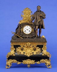 887Pendule mit Standbild Heinrich II von Frankreich 19. Jhdt. Bronze vergoldet und patiniert. Schwarzer Marmor. Emailzifferblatt. Messingwerk mit Schlag auf eine Glocke. H 68 cm 600 EUR |