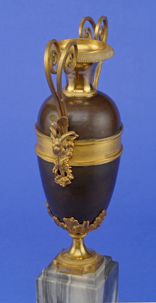 1015Paar Ziervasen Ende 18. Jhdt. Bronze feuervergoldet und patiniert. Henkelansätze in Form plastischer Widderköpfe. Marmorsockel. H 43 cm 800 EUR |