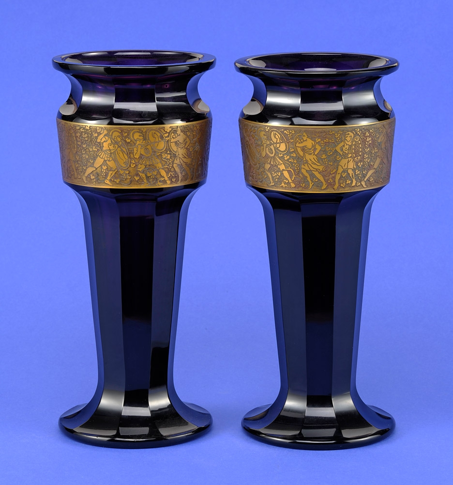 1191Zwei Vasen von Moser Karlsbad, Anfang 20. Jhdt. Amethystfarbenes Glas mit Goldrelief. Unterseiten bezeichnet. H 30 cm 200 EUR |