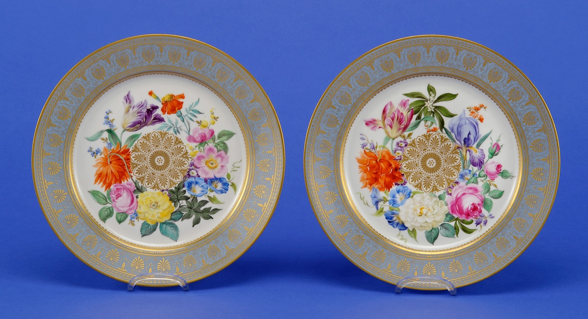 1192Zwei Sèvres-Teller Ende 19. Jhdt. Fein gemalte Blumengirlande und Vergoldung. Manufakturmarke. Ø 24,5 cm 1800 EUR |
