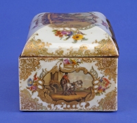 1160Deckeldose Ende 19. Jhdt. Umlaufend, goldgerahmte Landschaftsreserven mit Personendekor im Stil des 18. Jhdt. Vergoldete Metallmontierung. H 11 cm, B 18 cm, T 12,5 cm 120 EUR |