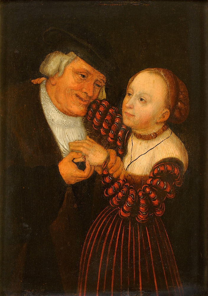 Cranach, Lucas d.Ä. 1473 Kronach - 1553 Weimar (Umkreis) Das ungleiche Liebespaar. Öl/Holz, 22 x 16 cm