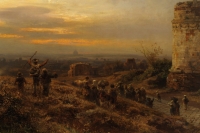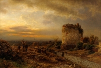 Achenbach, Oswald 1827 Düsseldorf - 1905 Düsseldorf Pilger auf der Via Appia mit Blick auf Rom. Signiert. Öl/Lwd./doubl., 90 x 136 cm