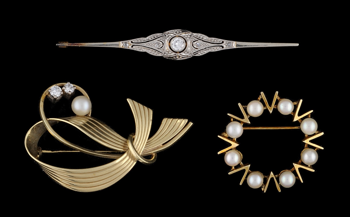1331Drei Broschen 585-Gelb-/Weißgold, Brillanten und Perlen. L 6 cm und kleiner. Auktion: Donnerstag, 05.12.2013 ab 12:00 200 EUR |