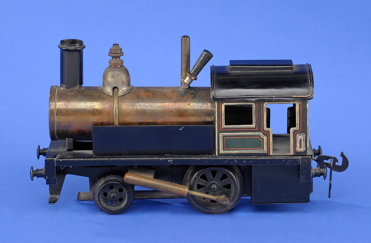 1637Dampflokomotive und Tender Anfang 20. Jhdt. Blech und Eisen, lackiert. L 43,5 cm (gesamt). Auktion: Freitag, 06.12.2013 ab 10:00 150 EUR |