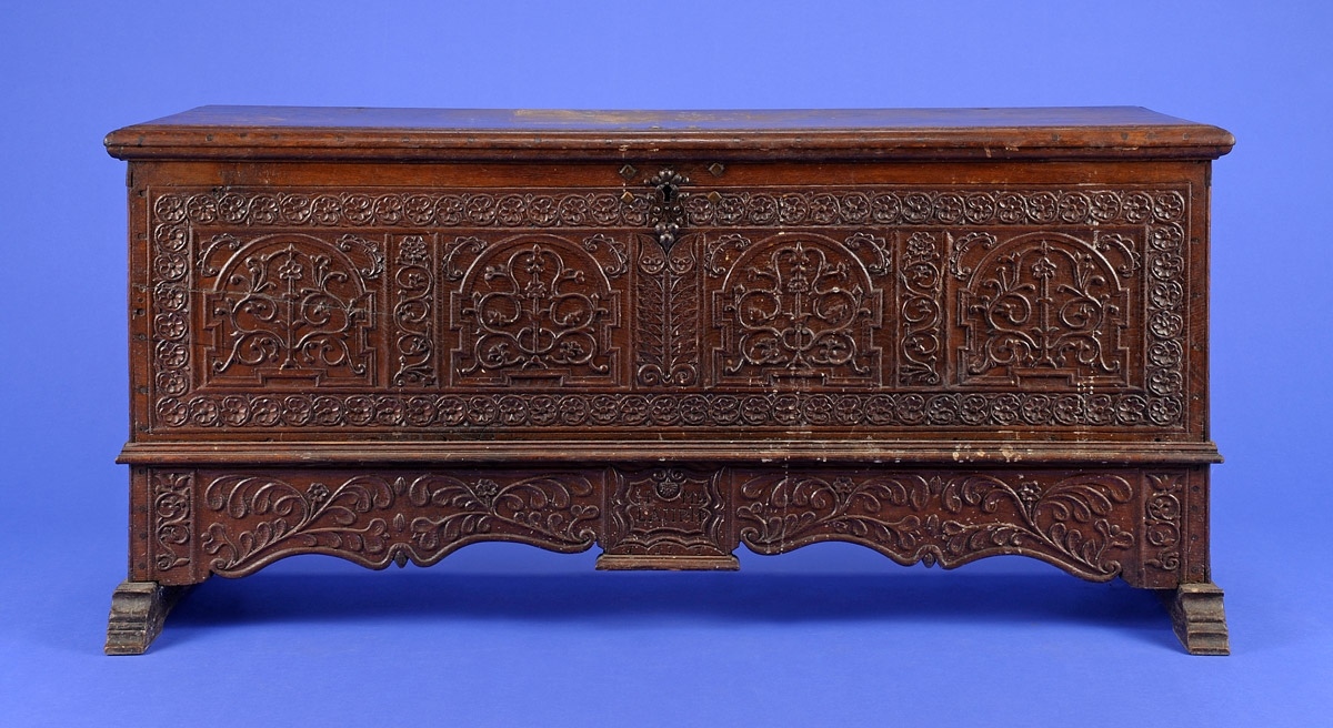 1661Flachdeckeltruhe Bergisches Land letztes Drittel 18. Jhdt. Eichenkorpus mit reich geschnitzter Schauseite. H 74 cm, B 154 cm, T 51 cm. Auktion: Freitag, 06.12.2013 ab 10:00 200 EUR |