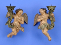 1660Ein Paar schwebende Leuchterengel Vollrund geschnitzt. Alte Farbfassung. H 20 cm. Auktion: Freitag, 06.12.2013 ab 10:00 150 EUR |
