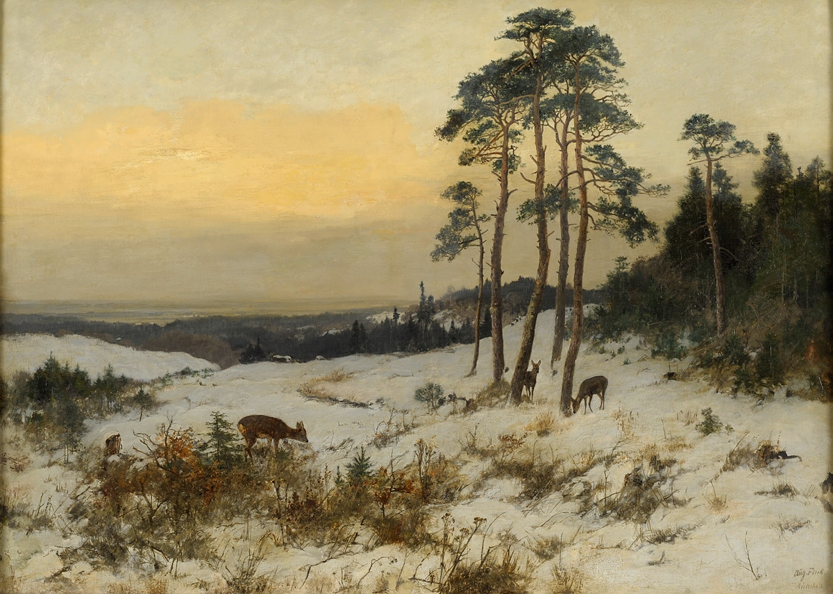 295Fink, August 1846 München - 1916 München Weite Winterlandschaft mit Rehen. Signiert. Öl/Lwd./doubl., 80 x 110 cm 400 EUR |