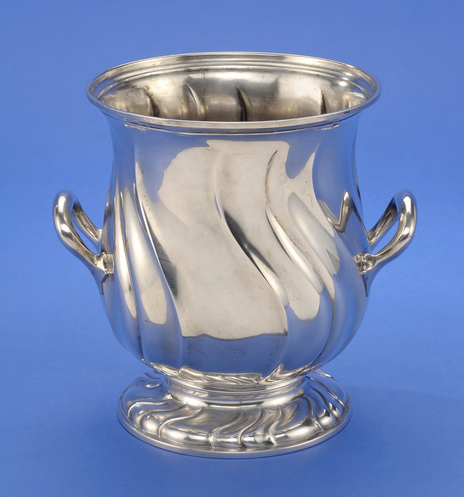 957Champagnerkühler von Sommer Breslau um 1890 Wandung mit bewegten Zügen und seitlichen Henkeln. Marken. 800-Feingehalt. 930 g, H 23 cm. Auktion: Donnerstag, 05.12.2013 ab 12:00 300 EUR |