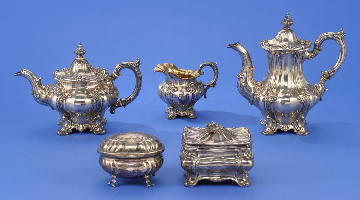 961Konvolut, fünf Teile 19. Jhdt. Kaffeekanne, Teekanne, Sahnegießer und zwei Zuckerdosen. Punzen. Verschiedene Feingehalte. Zus. 1874 g. Auktion: Donnerstag, 05.12.2013 ab 12:00 350 EUR |