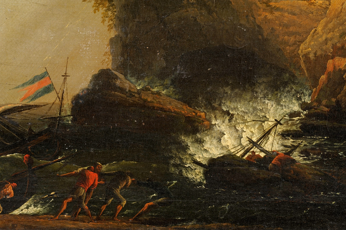 281Italienischer Meister 18. Jhdt. Stürmische Küstenszene mit havariertem Schiff. Öl/Lwd., 50 x 73 cm 300 EUR |