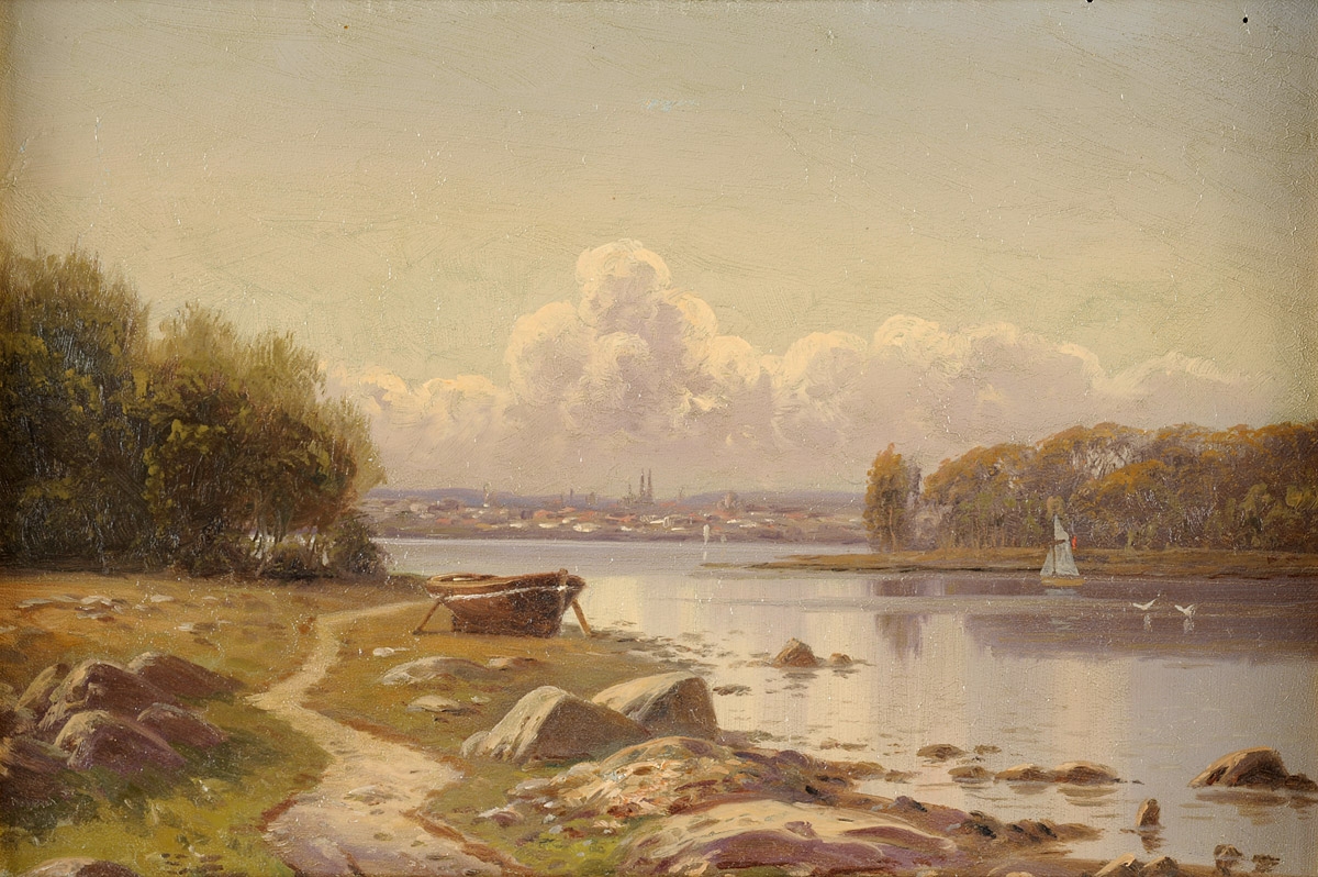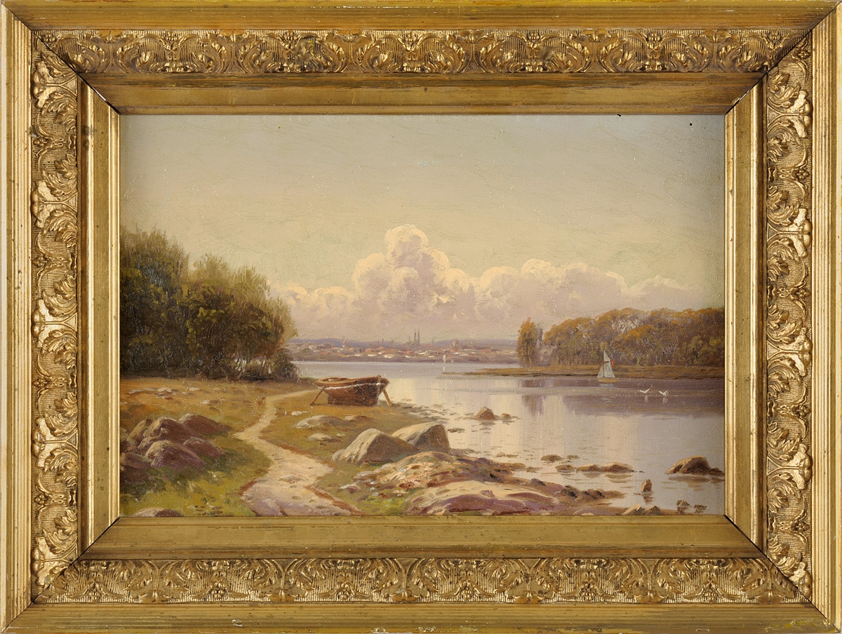298Dänische Schule 19. Jhdt. Strandpartie bei Roskilde. Rückseite bezeichnet. Öl/Lwd., 23,5 x 34,5 cm 200 EUR |