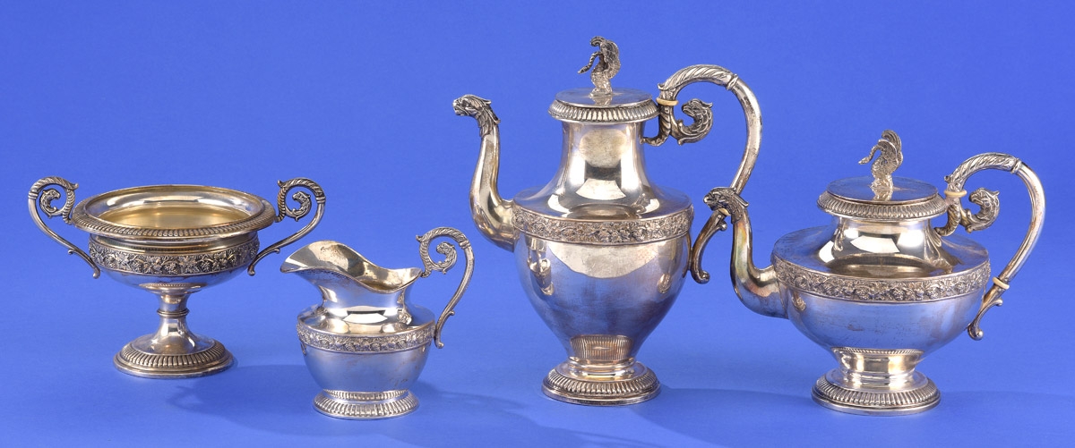 455Kaffeekanne, Sahnegießer und Zuckerdose Dorpat (Baltikum) für den Export nach St. Petersburg, zweite Hälfte 19. Jhdt. 300 EUR |