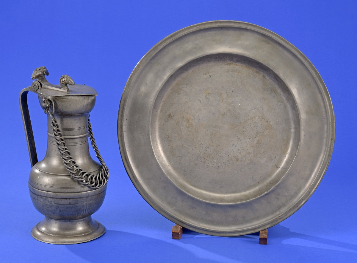 1048Schweizer-Kanne mit Kettenbehang und gr. Platte 18. Jhdt. 100 EUR |