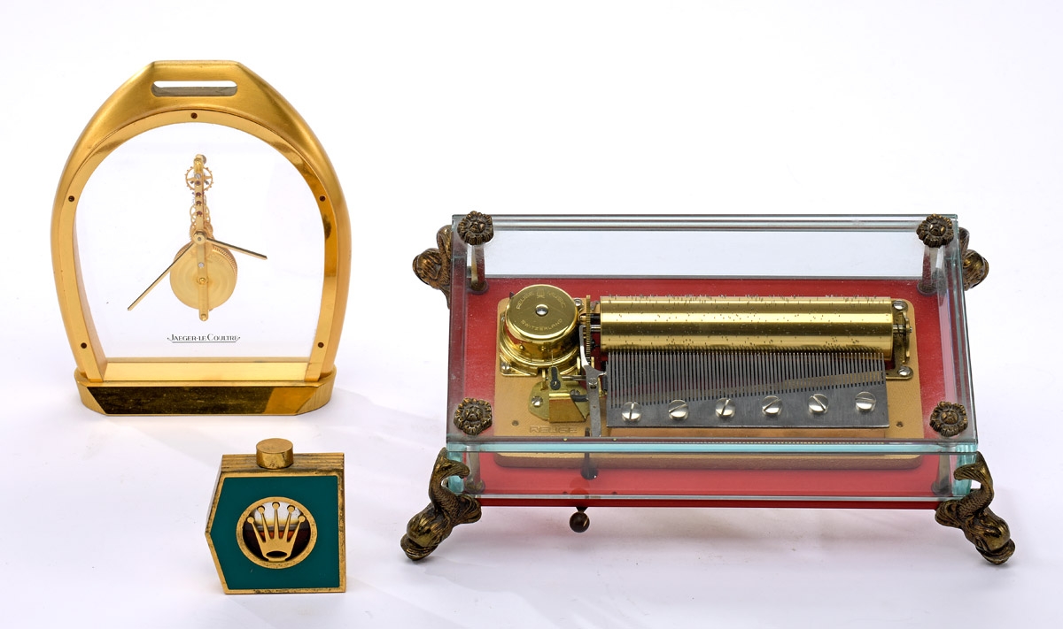 1211Spieluhr von Reuge, Tischuhr von Jaeger LeCoultre und Flakon von Rolex 150 EUR |