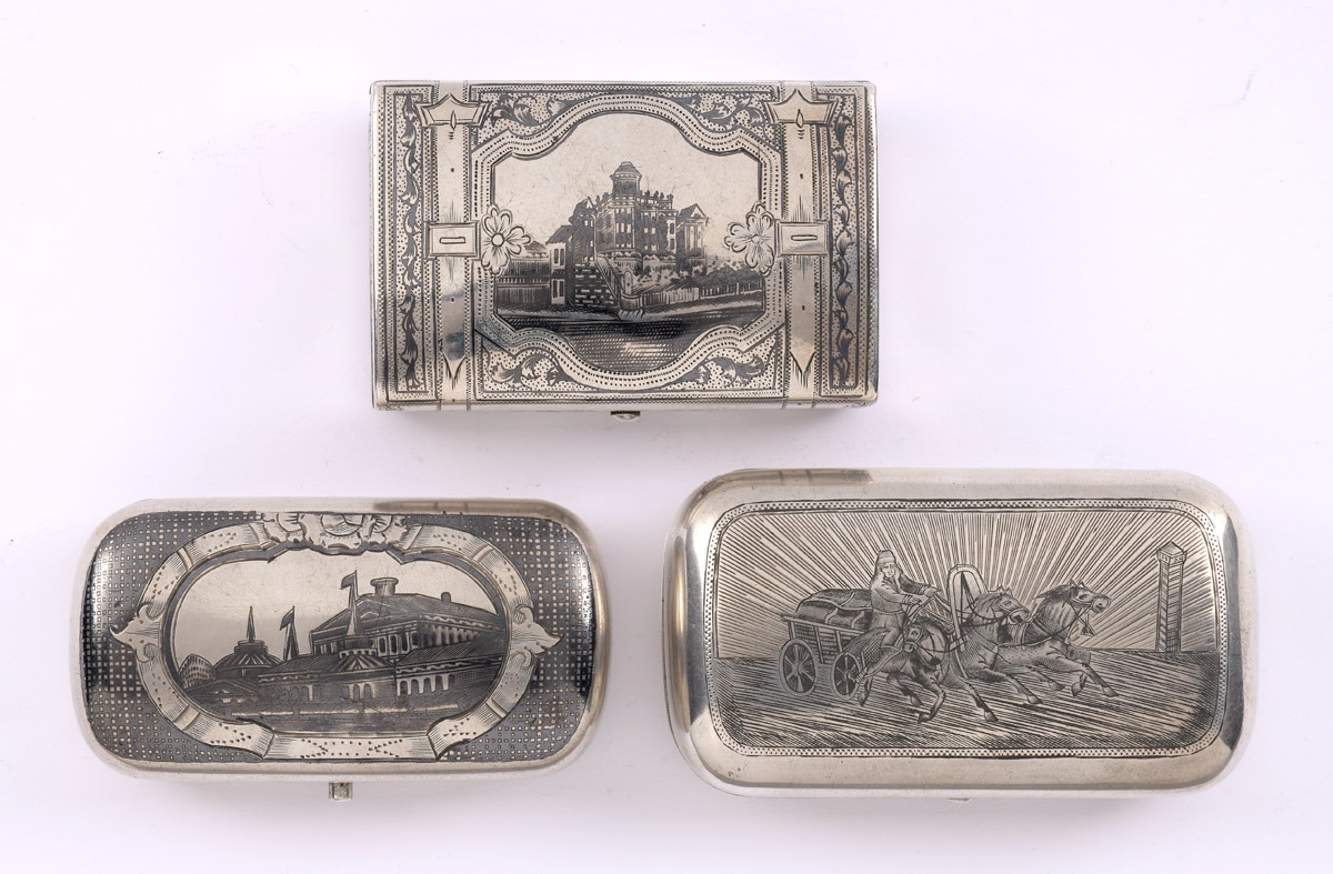 619Drei Niello-Zigarettendosen Moskau, zweite Hälfte 19. Jhdt. 150 EUR |