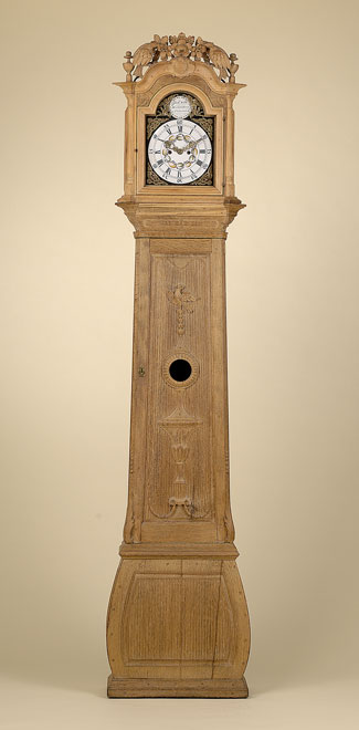 615StanduhrMahagonikorpus mit zentraler Nußbaumfüllung und seitlichen Spiegelfeldern. Messingwerk mit Schlag auf Glocke. H 227 cm 300 EUR |