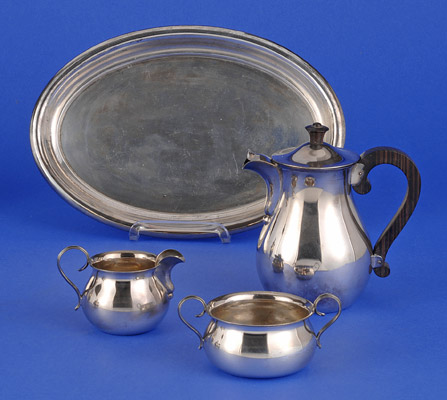 1681Mokkaservice Vier TeileMokkakanne mit Palisandergriff, Zuckerdose, Sahnegießer und Tablett. Marken. 835-Feingehalt. Zus. 718 g 150 EUR |