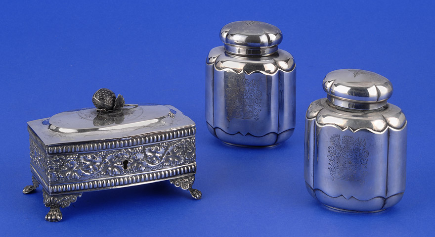 1657Kaffee-Teeservice im Louis XVI-Stil Deutsch um 1900Reicher Reliefdekor. Kaffeekanne, Teekanne, Sahnegießer, Zuckerdose und Tablett. Marken. 800-Feingehalt. Zus. 3982 g 1200 EUR |