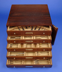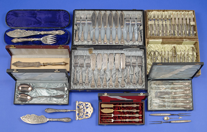 169383 diverse Besteckteile mit Perlmutt- bzw. Elfenbeingriffen in EtuisVersilbert. Nußbaum-/Mahagoni- und Lederetuis. 120 EUR |