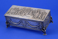 1656Deckeldose mit napoleonischen Szenen 19. Jhdt.Rechteckige Form auf vier plastischen Adlern. Innen vergoldet. Punzen. 1162 g. H 10 cm, T 14 cm, B 28 cm 300 EUR |
