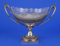 1670Obstschale mit Glaseinsatz Um 1900Klassizistische Form. Akanthus-Reliefdekor. Marken. 800-Feingehalt. H 32 cm, B 42 cm 900 EUR |