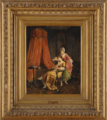 415Philips, Herman August 1844 Aachen - 1927 MünchenAtelierszene. Die Tochter des Künstlers dargestellt? Signiert. Öl/Holz, 45 x 27 cm 300 EUR |