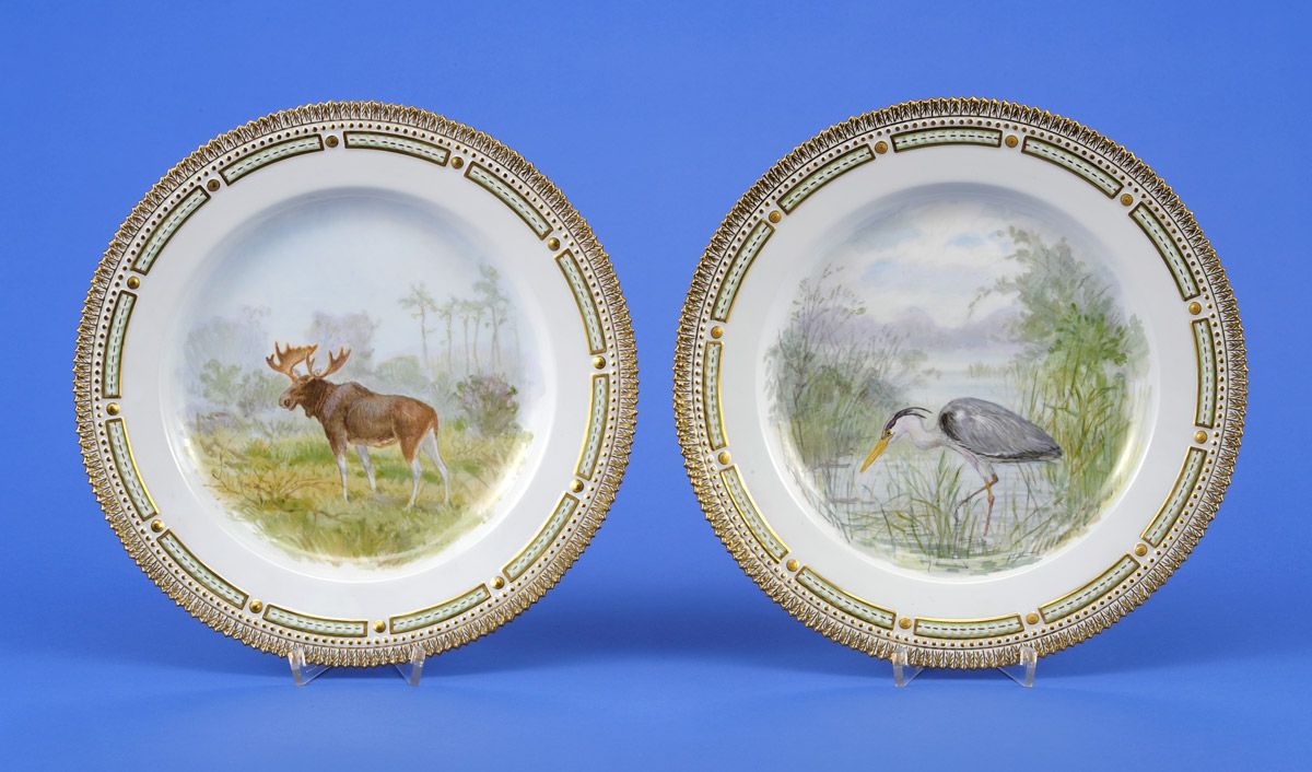 738Zwei Royal-Copenhagen Teller 20. Jhdt. Ardea cinerea. Alces alces. Rückseiten betitelt. Manufakturmarke. Ø 25,5 cm 100 EUR |