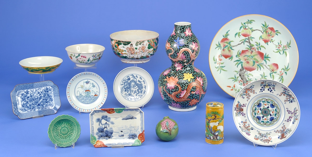 728Konvolut, 13 Teile China 19./20. Jhdt. Vase, Pinselhalter, Schalen, Platten u.a. Zum Teil Bodenmarken (drei Teile mit Haarriss). H 36 cm und kleiner. 400 EUR |