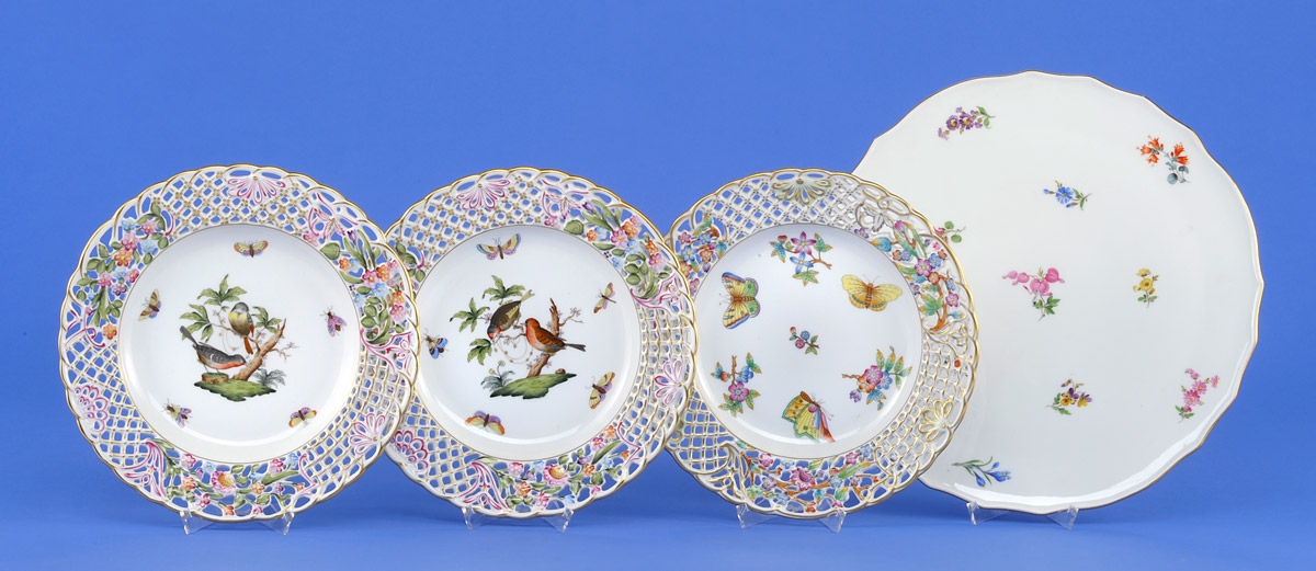 735Vier Teller der Manufakturen KPM, Höchst und Ludwigsburg Individuelles Vogeldekor. Manufakturmarken. Ø 25 cm und kleiner 120 EUR |