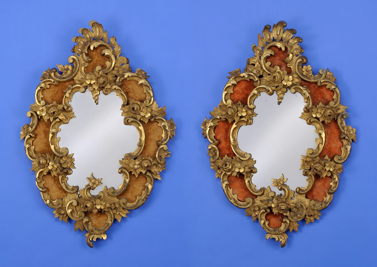 1454Ein Paar Spiegel im Rokokostil 19. Jhdt. Holz, geschnitzt und vergoldet. Samt. H 86 cm, B 58 cm 400 EUR |