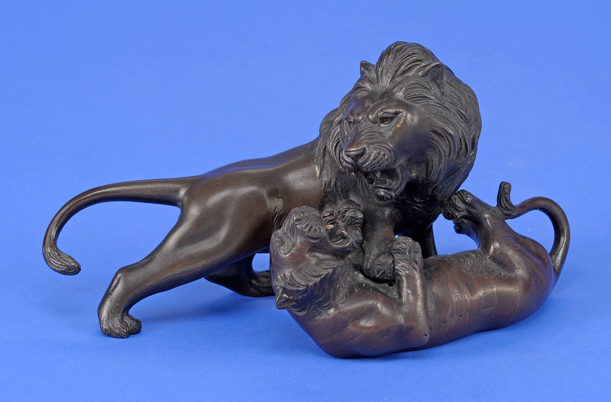 1499Kämpfende Wasserbüffel Japan, Ende 19. Jhdt. Bronze. Siegelmarke. Geschnitzte Holzplatte. H 30 cm, T 26 cm, L 93 cm 300 EUR |