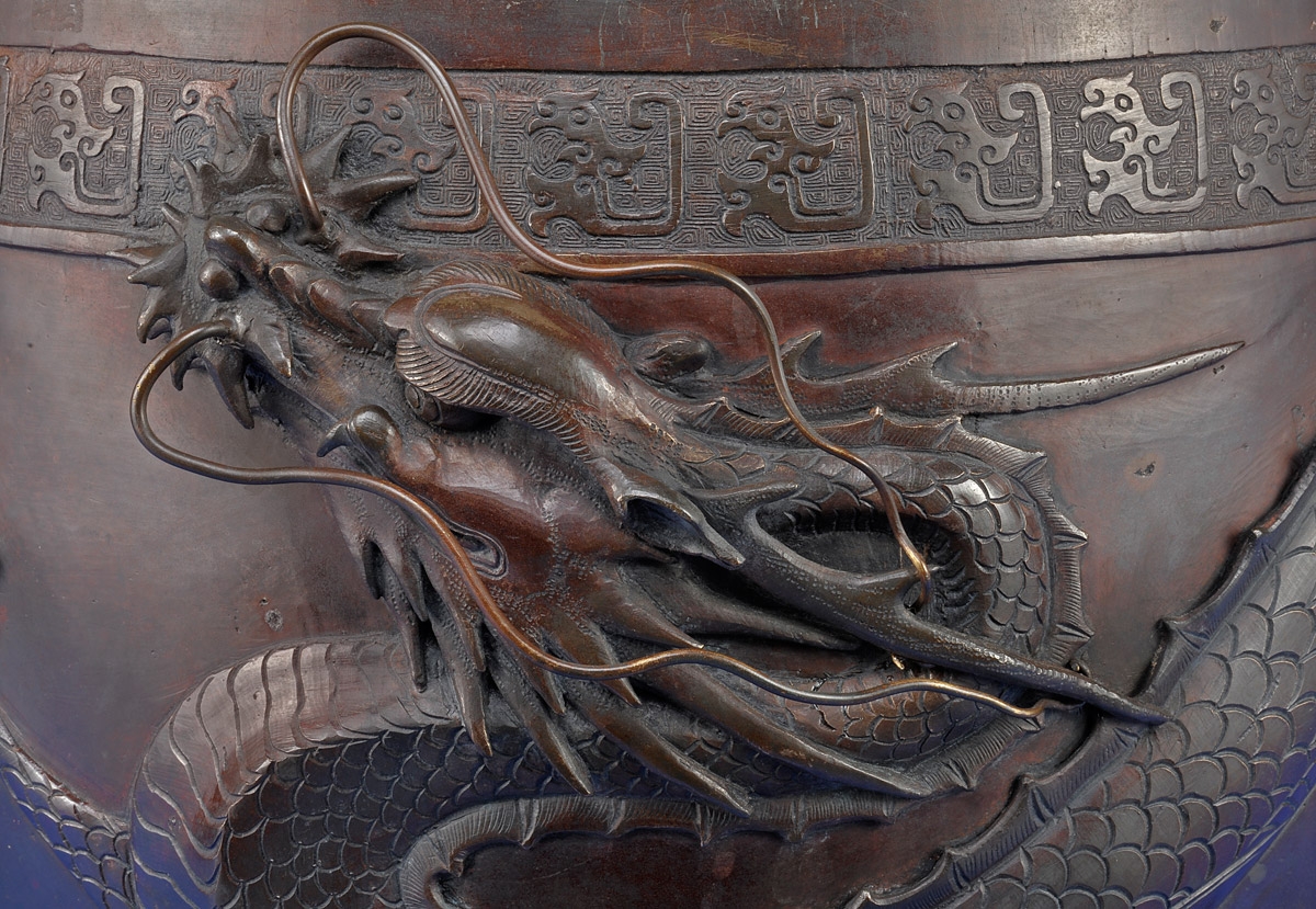 1479Großer Übertopf China, Ende 19. Jhdt. Bronze. Wandung mit umlaufendem Drachen. H 46 cm, Ø 50 cm 200 EUR |