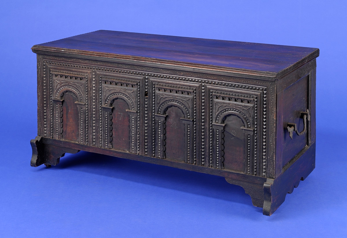 1455Flachdeckeltruhe Norddeutsch 18. Jhdt. Eichenkorpus mit geschnitzter Schauseite. H 68 cm, B 129 cm, T 62 cm 100 EUR |