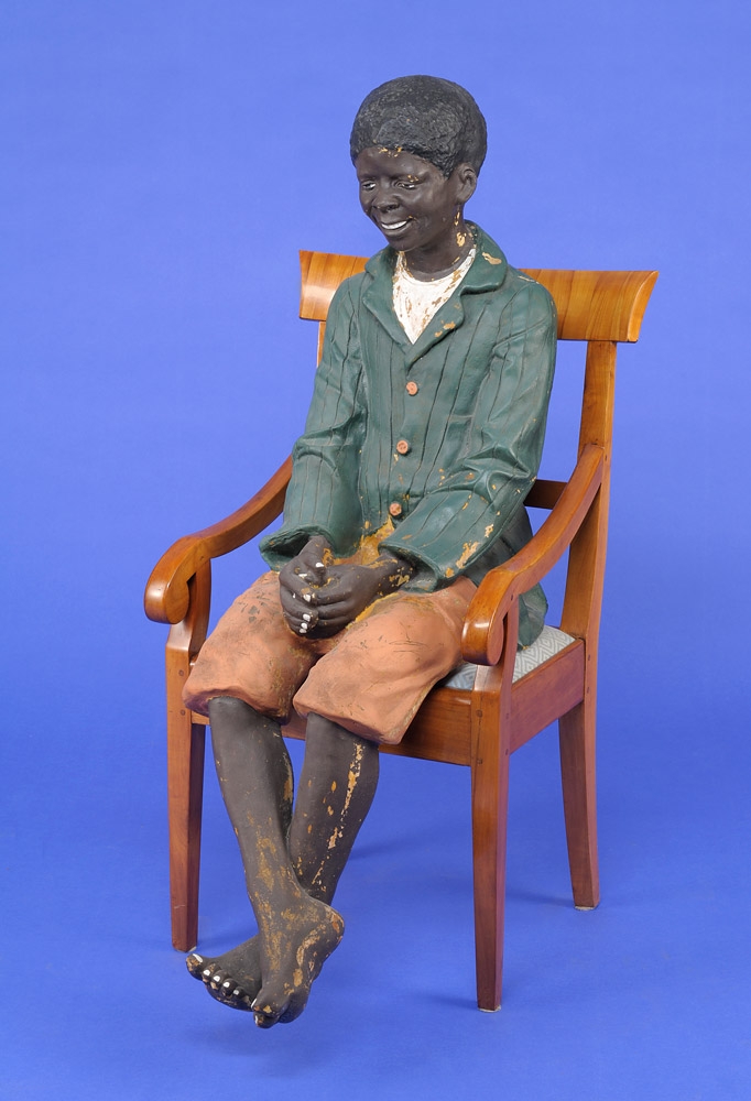 1569Visitenkartenanbieter in Form eines plastischen Pagen 19. Jhdt. Vollrund geschnitzt. Passiger Sockel. H 168 cm 1000 EUR |
