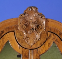 1582Schreibschrank im Biedermeierstil Dreischübig. Schreibklappe. Vielschübige Inneneinrichtung. Passiger Aufsatz. Birkenmaser, Birke u.a. Hölzer. H 208 cm, B 107 cm, T 57 cm 300 EUR |