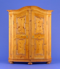 1585Schrank Um 1800 Zweitüriger, frontal leicht gebogter Korpus mit gekröpften Füllungsfeldern. Vorkragende, profiliert gekehlte Gesimsleiste. Nadel- und Obstholz. H 190 cm, B 145 cm, T 42 cm 200 EUR |