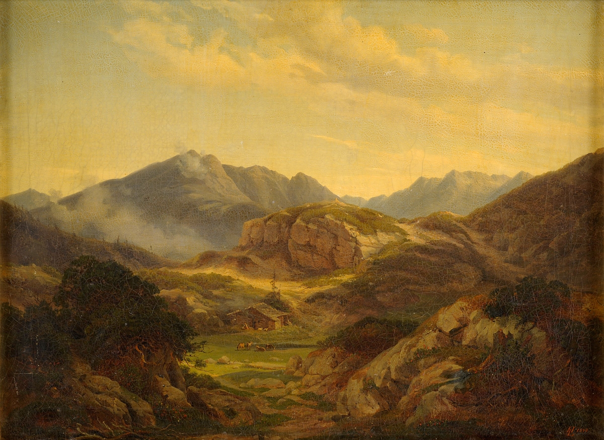 Lungkwitz, Hermann 1813 Halle - 1890 Austin (Texas) Motiv bei Hallstadt (Salzkammergut). Monogrammiert. Rückseite bezeichnet. Öl/Lwd., 43 x 57 cm