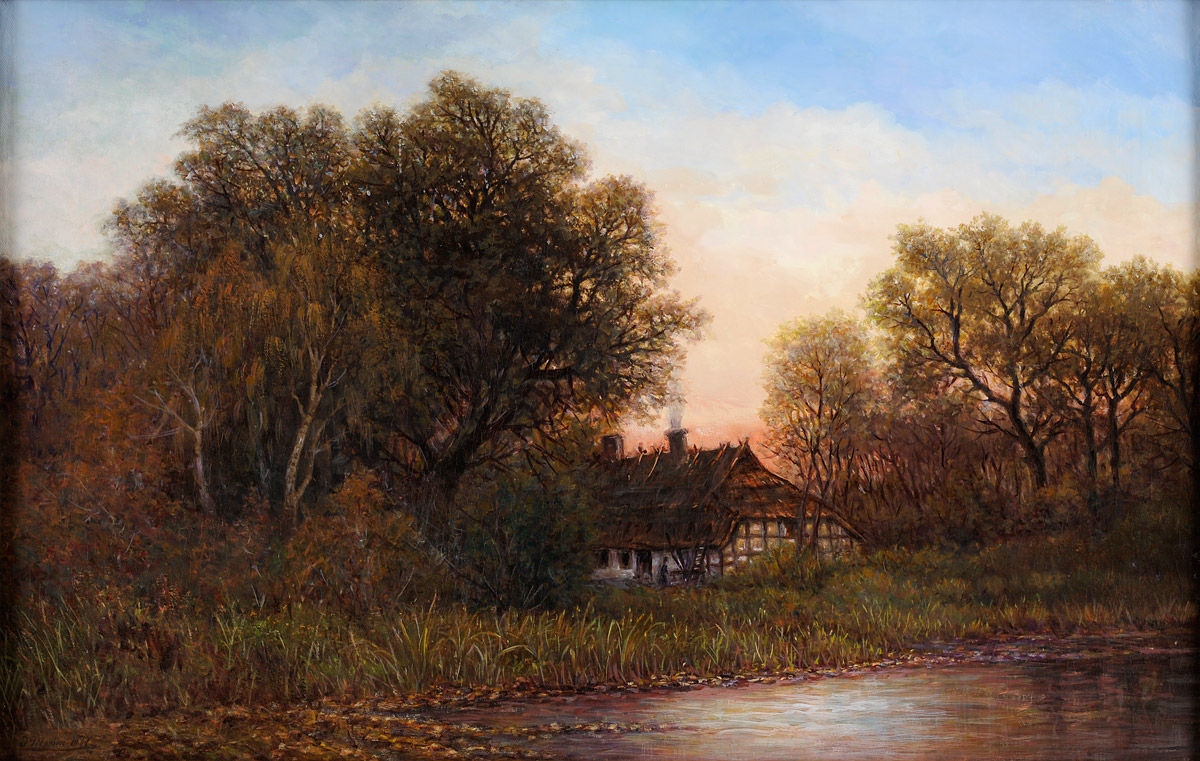 Monien, Julius 1842 Königsberg - 1897 Königsberg Waldhütte im Spätherbst. Signiert. Datiert 1877. Öl/Lwd., 70 x 110 cm